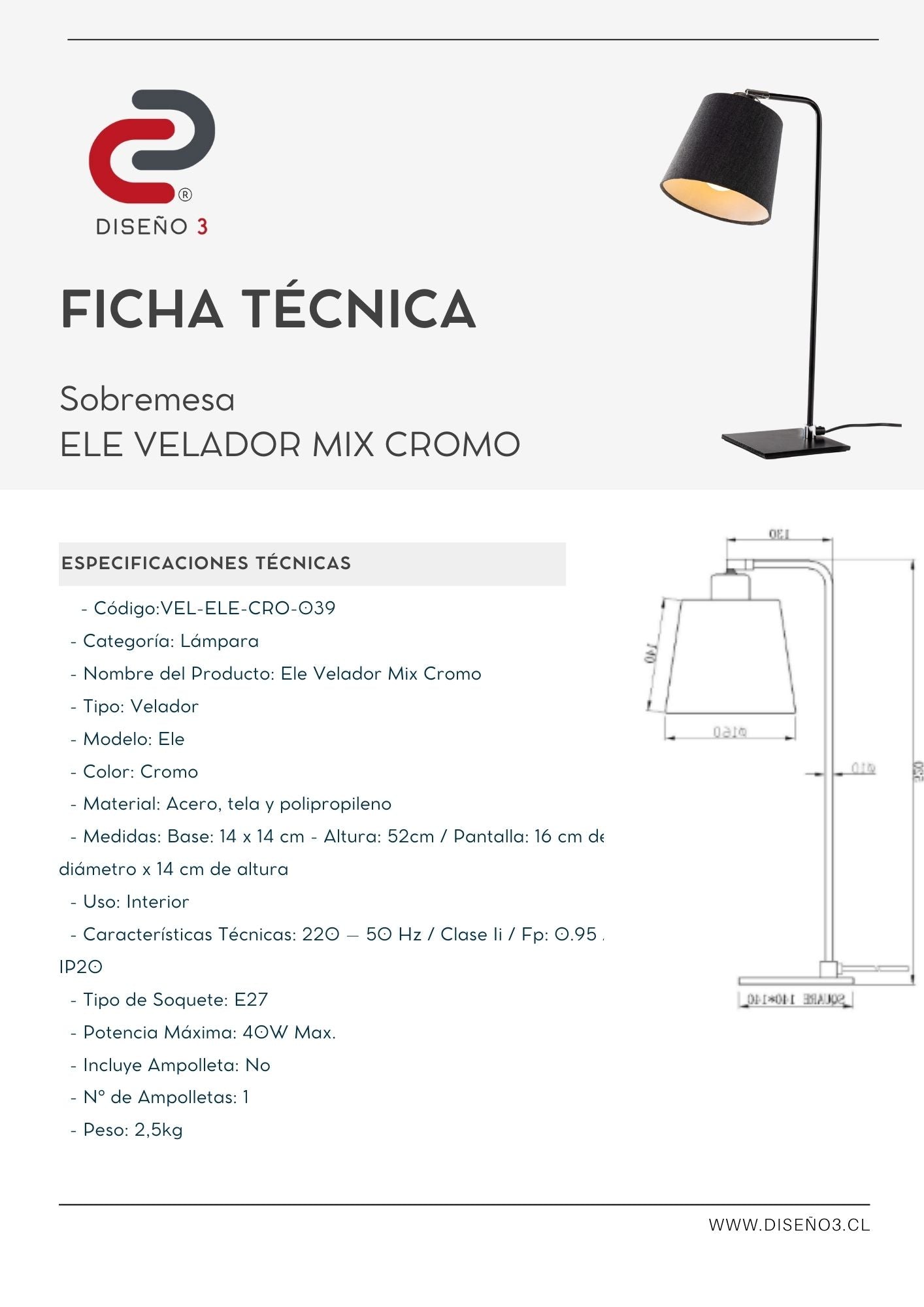 Medidas: Base: 14 x 14 cm - Altura: 52cm / Pantalla: 16 cm de diámetro x 14 cm de altura